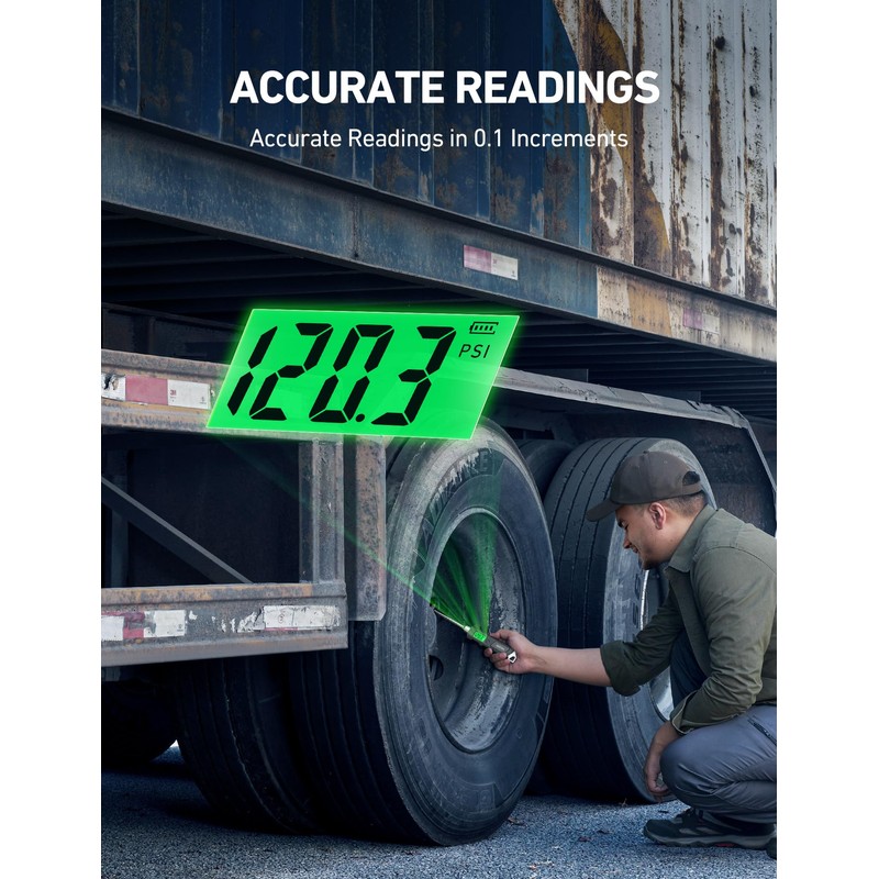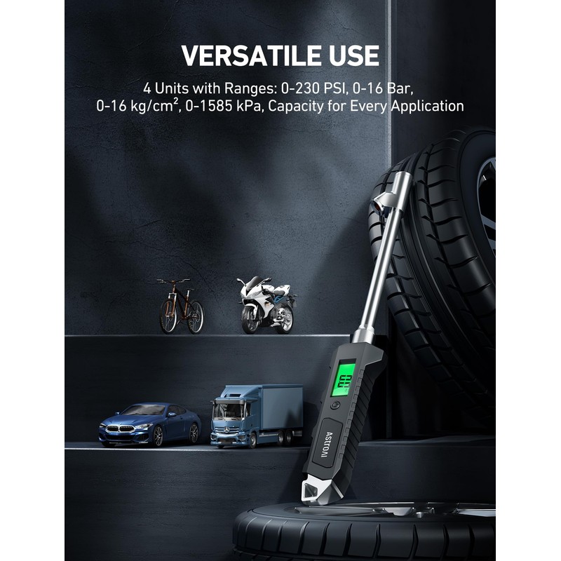 - Green Backlit LCD display and flashlight for visibility in dimly light areas, easy-to-read digits help you easily measure your vehicle's tyre pressure