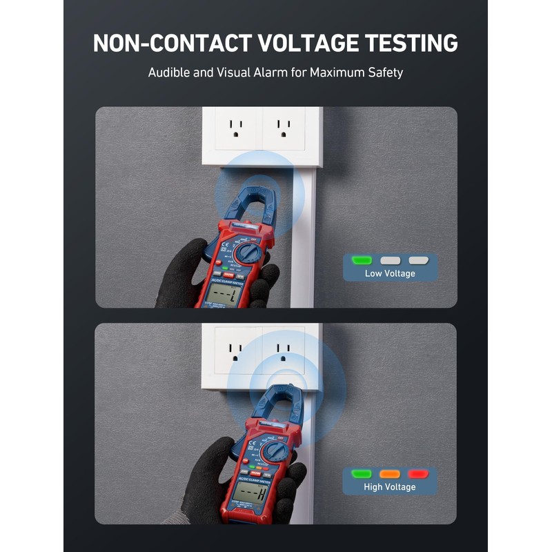 • Non-contact Voltage Testing: This Clamp Meter features non-contact voltage testing with sound and light alarms. When the Meter senses a weak AC signal, the green indicator light will come on and the buzzer will emit a slow, audible beep. when the Meter senses a strong AC signal, the red indicator light will come on and the buzzer will emit a brief beep