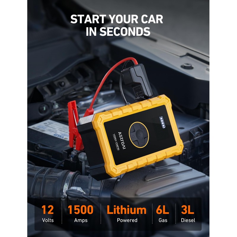 - HIGH PERFORMANCE, START DEAD BATTERIES: Safely jumpstart a dead battery in seconds with this compact and powerful battery jump starter. This 1500-amp lithium booster can produce up to 20 jump starts on a single charge, and is rated for up to 6L gasoline and 3L diesel engines. The S8 AIR battery pack can reliably start 12V batteries easily even at -4~140℉. It's universally compatible with cars, trucks, motorcycles, lawnmowers, SUVs, snowmobiles, boats, etc