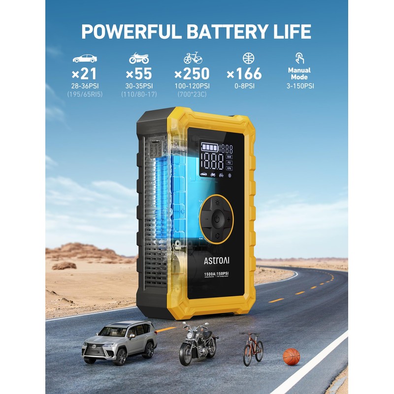 AstroAI S8 Air Jump Starter with Air Compressor, 1500A Car Battery Jumper Starter Portable (6.0 Gas/3.0L Diesel) with 150PSI Cordless Auto-Shutoff Tire Inflator, 12V Battery Charger Booster(Yellow)