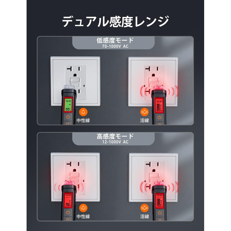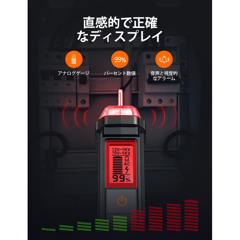 - 多機能で直感的なインジケーター – 電圧を検出すると先端の赤いライトが発光し、画面のバックライトも赤く発光してアラーム音がなります。検出した電圧の信号が強くなる、あるいは電圧源に近づくと画面のアナログゲージ、パーセント数値、ブザー音量が増えます。