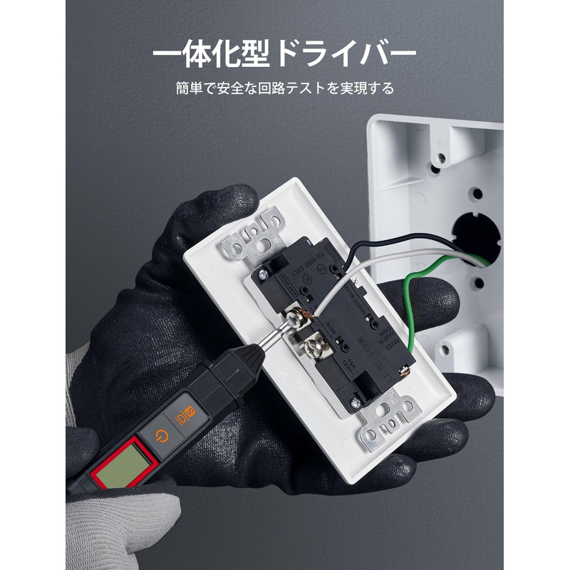 - 非接触型 – この非接触型の電圧計は安全性が高く、視覚と音声によるアラーム機能があります。電圧計の先端を端子台、ソケット、配線などに近づけることで、NCVプローブを使用してAC電圧を計測することができて、回路に触れる必要はありません。配線、端子、スイッチ、ジャンクション・ボックスの活線と中性線を識別できます。ブレークポイントテストで簡単に利用可能。