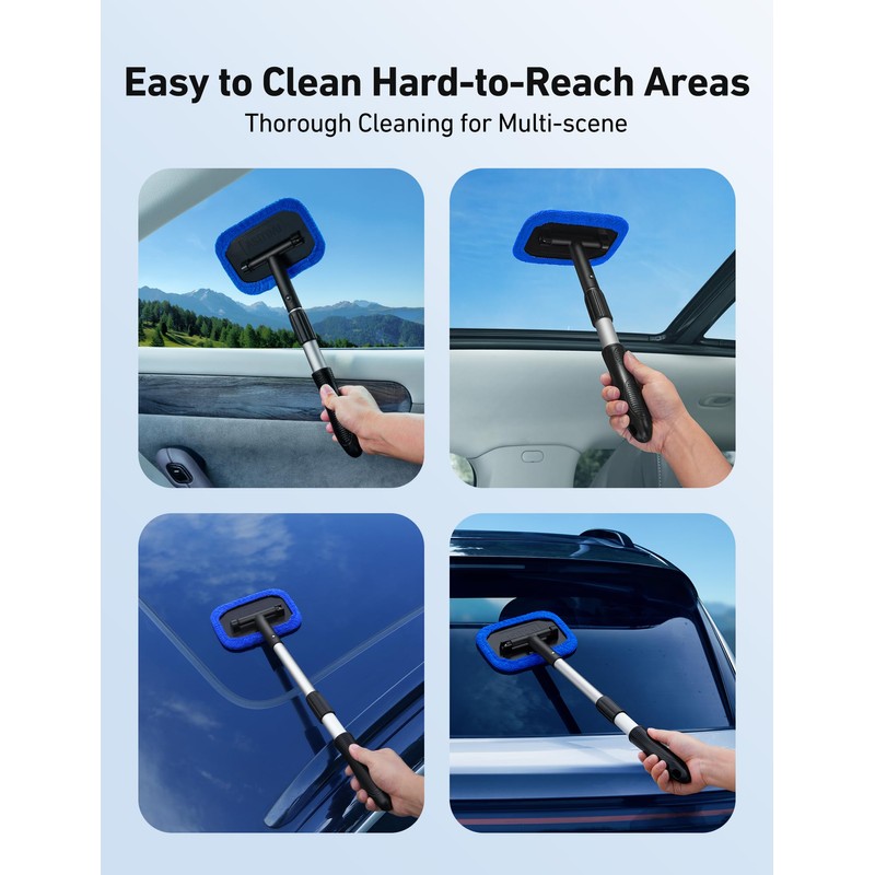 - Fast and Easy to Clean Auto Windshield: Clean car window interiors and exteriors without straining. No more hurting your back. With the extra long extension handle and pivoting head getting to those hard-to-reach car window bases is simple