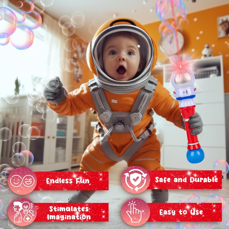 - ASTRONAUT BUBBLE BLOWER: Set off into a world of bubbly fun with our Astronaut Bubble Gun! This incredible Light-Up Bubble Blower allows your child’s imagination to soar as they embark on thrilling adventure to create memorable and bubble-filled plat times.