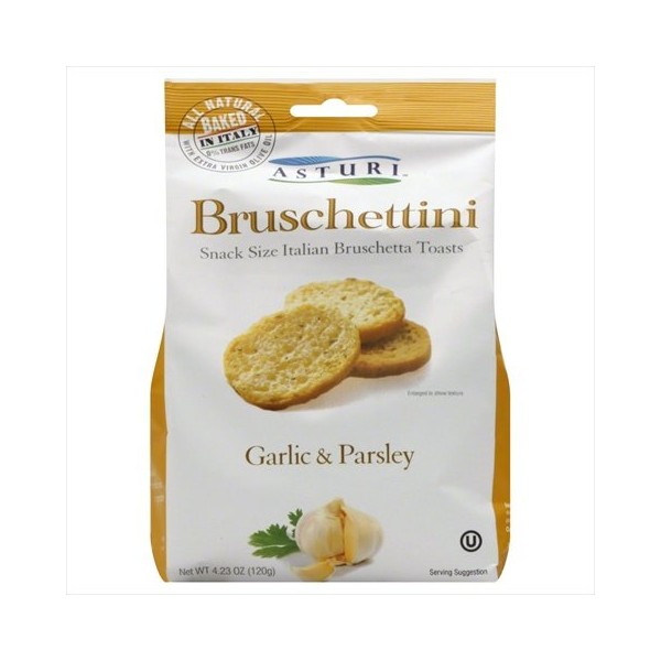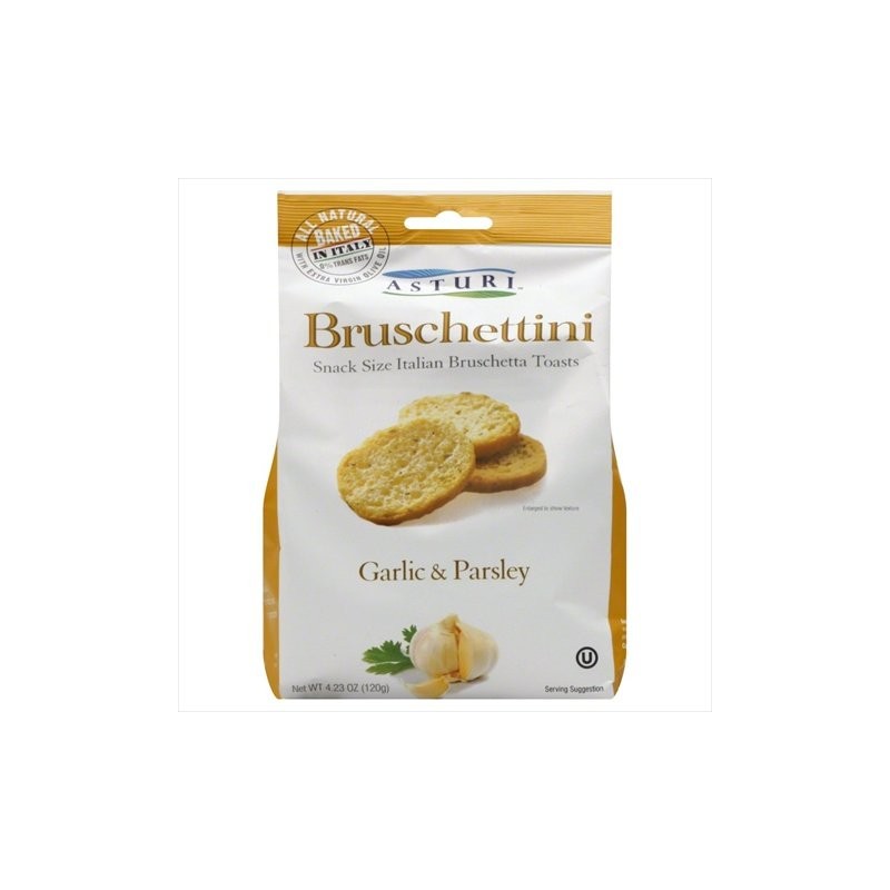 Our all natural bruschetta toasts are baked using only the highest quality olive oil and the finest garlic and parsley. They are the perfect snack all by themselves or topped with almost anything a great appetizer for any occasion. With their enticing flavor and toasted to perfection our asturi bruschettini are a little bite of italy. Thats because each asturi bruschettini is baked in italy using age-old artisan recipes and all natural ingredients. Our asturi bruschettini contain no preservatives or artificial flavors.. Great for cheese spreads dips. Kosher made with all natural ingredients. Capacity - 4.23 oz.. Case of 12