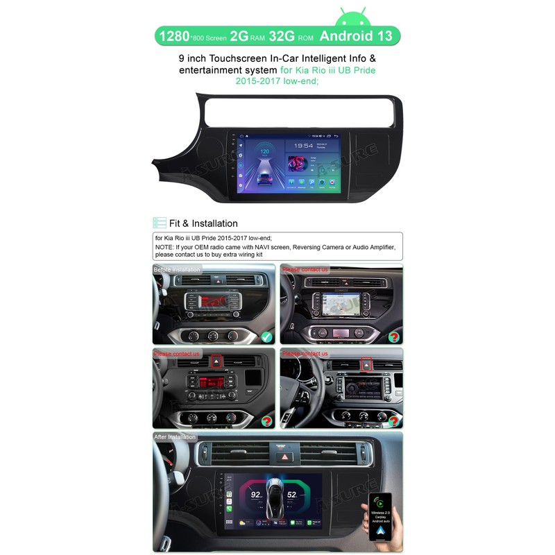 Asure Car Stereo Radio Upgrade for Kia Rio Pride UB 2015-2017 Low-end Cars,9 inch 4core 2GB+64GB GPS Navigation Head Unit with Carplay Android Auto,1280x800 Touchscreen Car Dash Multimedia Player