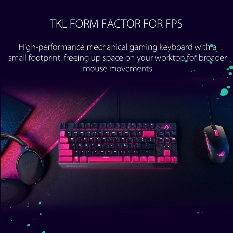 - ASUS ROG Strix Scope TKL Electro Punk Edition Mechanical Gaming Keyboard comes in a stunning black-and-pink cyberpunk theme. It features German-made Cherry MX red switches for precision input with responsive keystrokes for an enhanced gaming performance
