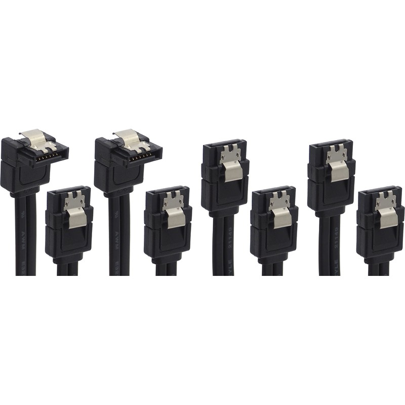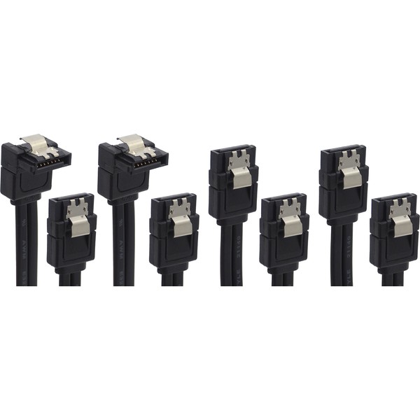 - A total of 4 pieces of 4 pieces of SATA cables with an L-shaped connector on one side and two straight connectors on both ends. Both connectors come with a locking latch to secure the cable. Black and white terminals make it easy to distinguish the connections