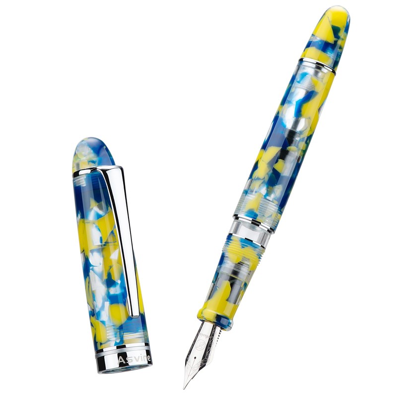 Asvine P50 Piston Fountain Pen Yellow Marble Resin, Medium Nib Silver Trim Smooth Writer Collection with Pen Case Gift Set