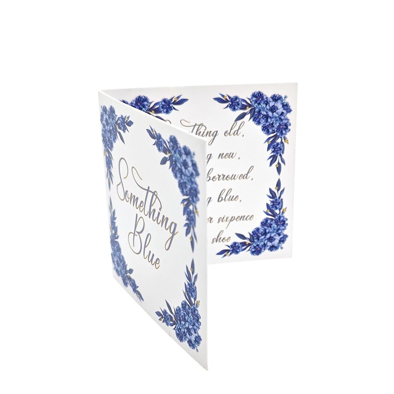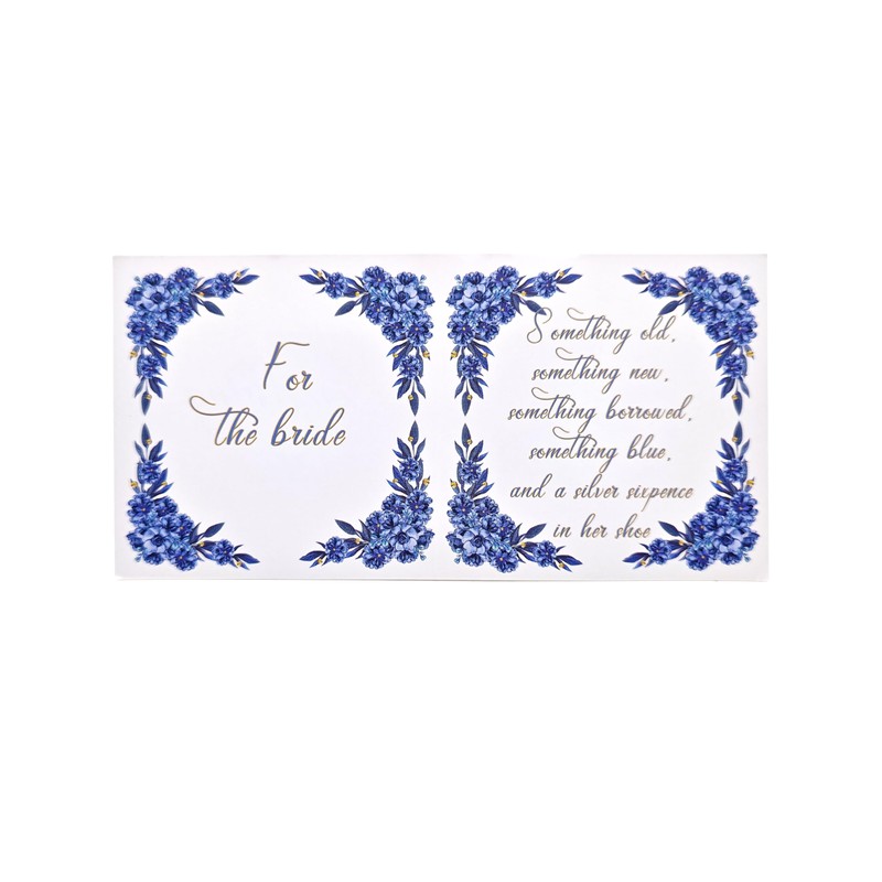- BRIDE’S CARD WITH SOMETHING BLUE POEM: Inside the box is a beautifully crafted card for the bride, featuring the traditional "Something Blue" poem, adding a personal and sentimental touch.