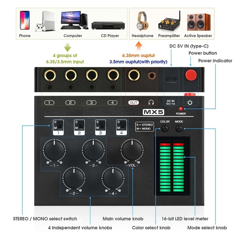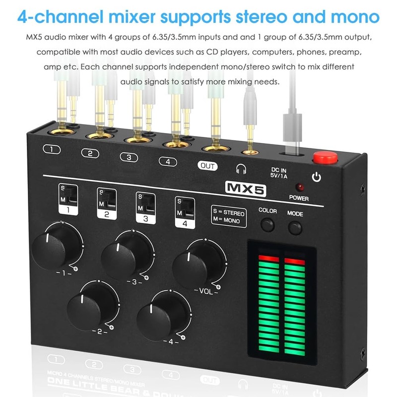 • 4-channel mixer supports stereo and mono: MX5 audio mixer with 4 groups of 6.35/3.5mm inputs and 1 group of 6.35/3.5mm output, compatible with most audio devices such as CD players, computers, phones, preamp, amp etc. Each channel supports mono/stereo switch to mix different audio signals to satisfy more mixing needs.