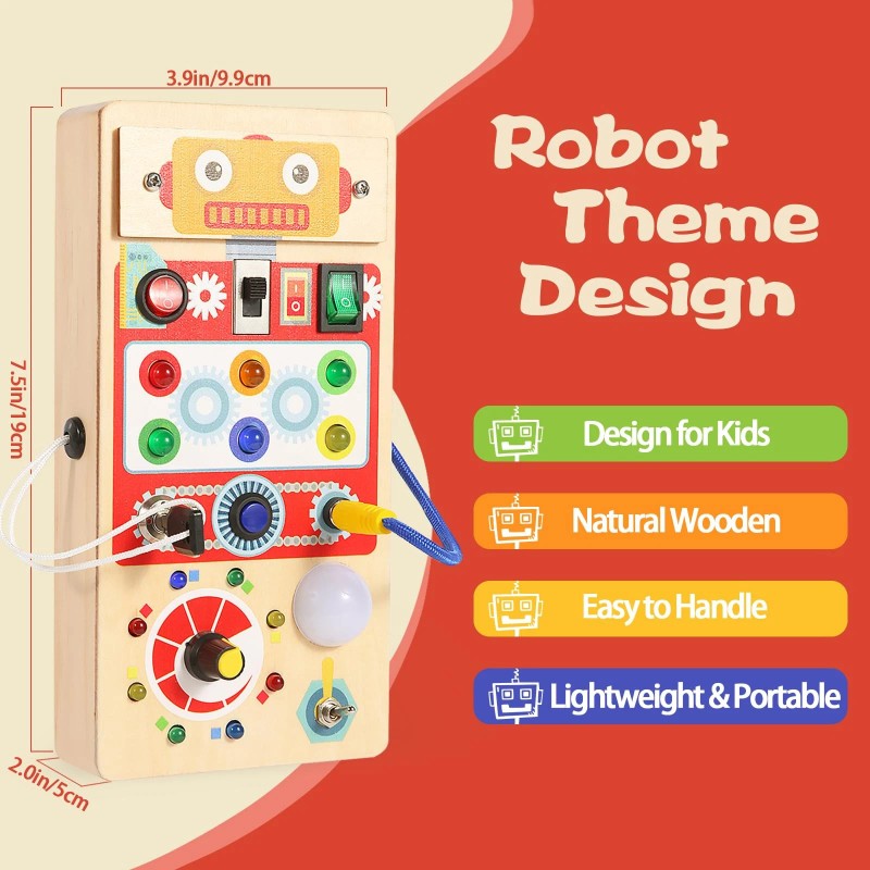 【Learning and Playing and Exploring】Robot Busy Board with LED can identify different colors, switches. The children's activity board can promote the brain development of children. These busy board not only light up the LED, but also have sound settings to attract your child's attention. This sensory toy for 3 year olds can exercise your baby's logical thinking, hands-on and exploratory skills