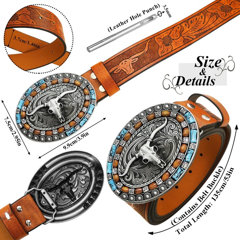 - 【Western Cowboy Waist Accessory】:One order includes 1 pc brown men's western belt with belt buckle, 1 pc interchangeable belt buckle and 1 pc leather hole punch. This men's leather country belt with a stylish rodeo belt buckle with engraved bull head detail on the belt that exudes rugged charm, the long-horned bull items is a symbol of bravery, strength and prosperity, can add a touch of western flair to your outfit, it is a must-have accessory for any cowboy or western enthusiast.