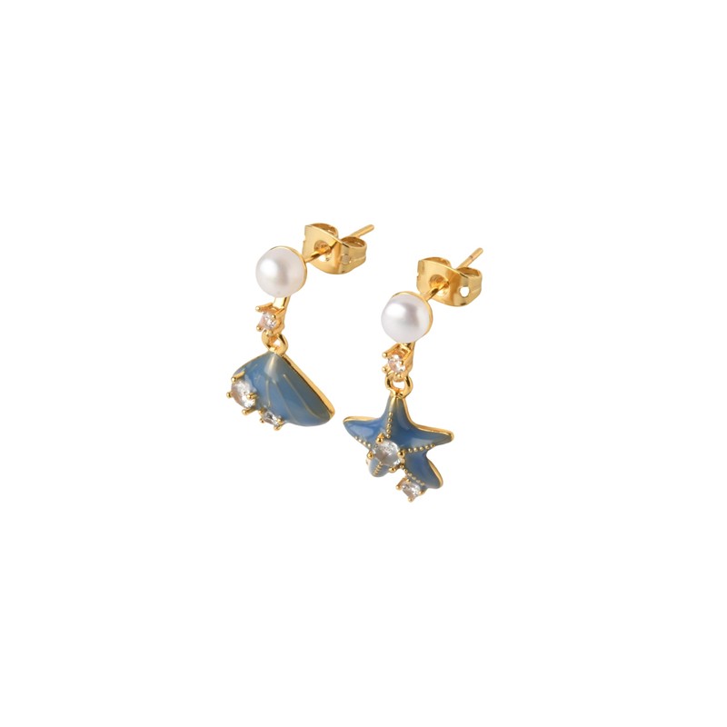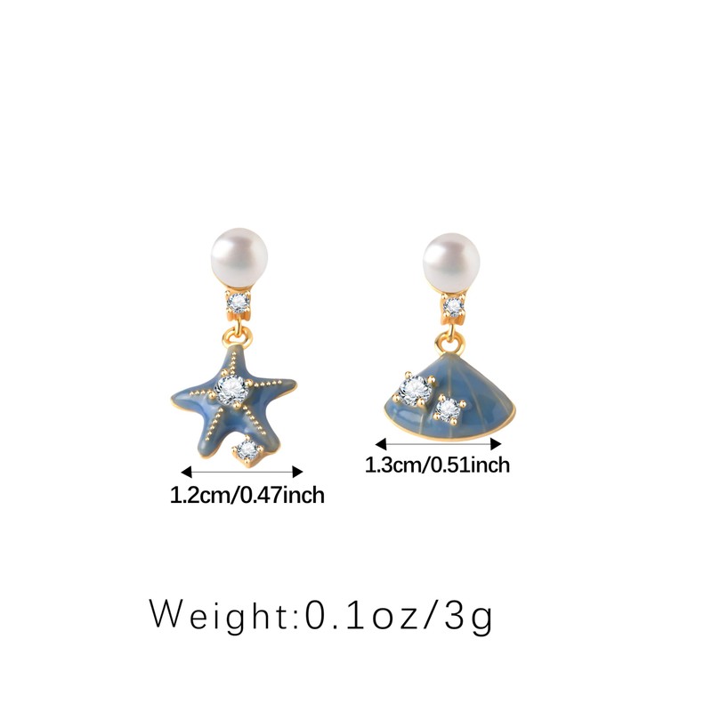 - Mismatched design: Charming asymmetrical earrings featuring blue starfish and shell designs, adorned with sparkling crystals and natural pearls.