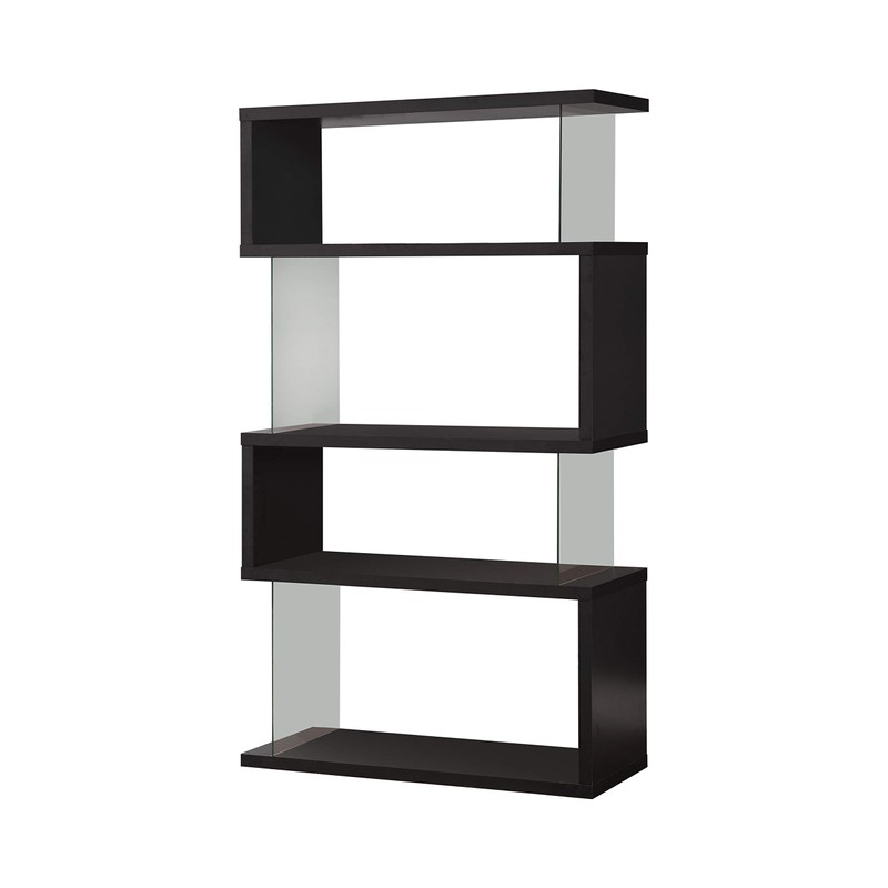 With a striking, zig-zag design, this bookcase exudes contemporary charm. Though they appear to be open, its sides are enhanced by tempered glass panels to help keep books and belongings in one place. With four convenient tiers, it provides ample space for storage. Made with MDF and engineered veneer, this bookcase offers quality and durability. It's available in a black or white finish, giving you two attractive options to match your home decor.