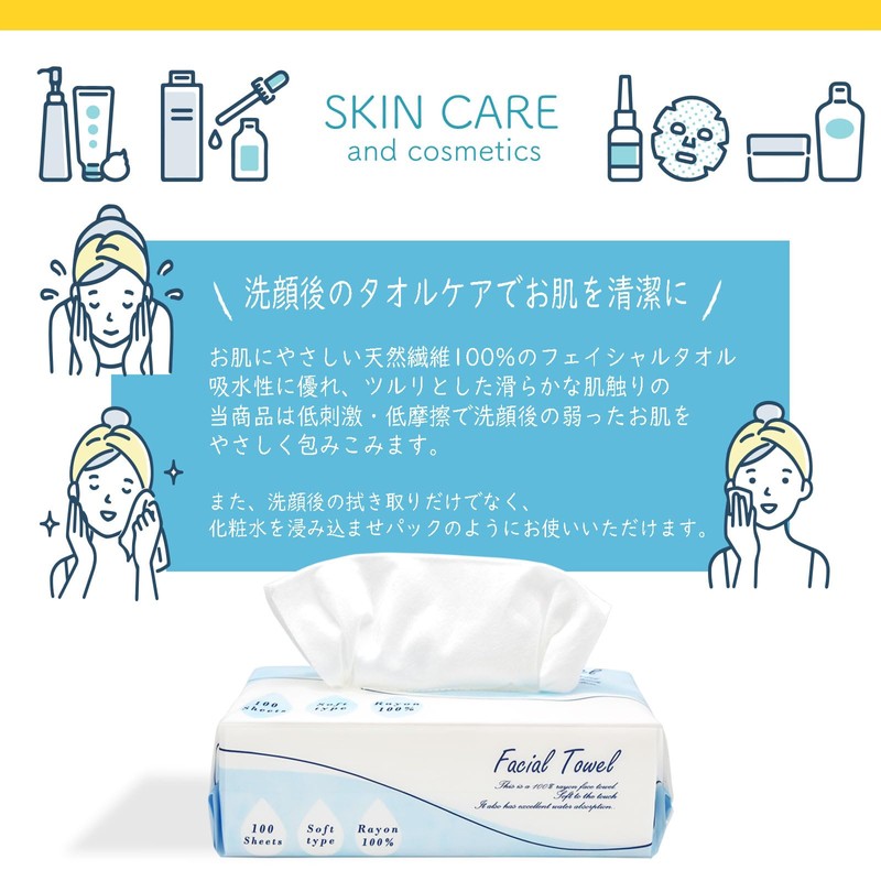 - Disposable towels made from 100% natural rayon that are smooth and gentle on the skin and do not pile up fibers. It has high moisture absorption and is environmentally friendly, so it can be used safely even by people with sensitive skin
