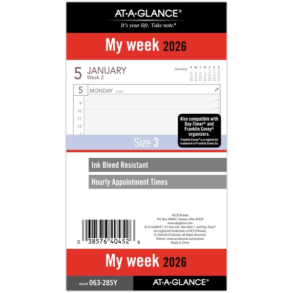 AT-A-GLANCE 2026 Planner Refill, Weekly, 3.75" x 6.75", Portable Size 3 Loose-Leaf (063-285Y-26)