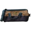 Constructed of HD canvas with wide mouth opening. Includes long shoulder strap. 8 interior and 10 exterior pockets. Size: 9-1/2" x 21".