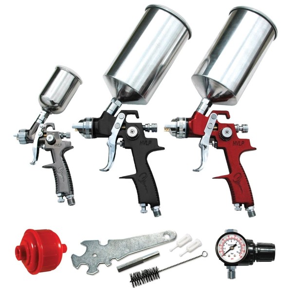 Guns have Stainless steel needle and nozzle sets. Knob for spray pattern adjustment. Operating pressures of 15-45 psi. Air inlet: 1/4". Air consumption: 7.0 to 9.0 CFM Contains: (1) 1.8mm Primer spray gun. (1) 1.4mm Topcoat spray gun. (1) 1.0mm Touch-up spray gun. (2) 1L Aluminum cups (ATD-69009-09, ATD-6900-08 Lid for cup). (1) 125cc Stainless steel cup (ATD-6900-21, ATD-6900-20 Lid for cup). (1) Locking pressure regulator (0-180 psi, 0-12 BAR). (1) Face mask. Cleaning kit: (1) Spanner wrench; (1) Hex wrench; (1) Brush; (2) Filters.