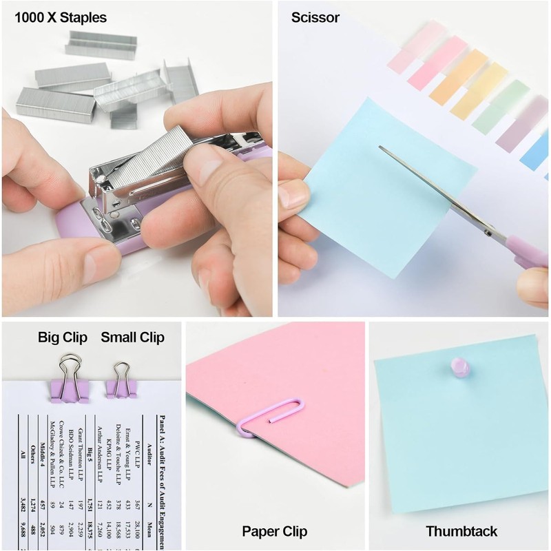 ATDORO Office Supply Set, 10 Set Desk Accessories Include Stapler and Tape Dispenser Lndex Tabs Staple Remover Hole Punch Scissor and Clips Accessories Office Supply for Students (Purple)