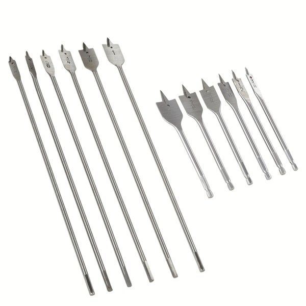 ATE Pro. Tools - 12pc Spade Drill Boring Bit Sets {INCLUDES} - (6) Hex Quick Change 6" Bits & (6) Quick Change 16" Long Bit Sets {SIZES} - (6" Bits = 3/8" (10mm), 1/2" (13mm), 5/8" (16mm), 3/4" (19mm), 7/8" (22mm), and 1" (25mm) | (16" Bits = 3/8", 1/2", 5/8", 3/4", 7/8" and 1") {QUALITY} - Bits are Heat-treated Carbon Steel, polished and ready for your woodworking projects. Heavy Duty contruction for consistant performance. {DESIGN} - Featuring a quick-change 1/4" Shank, Spur Points to Ensure Quick and Accurate Positioning. Double-fluted, a smooth chip removal everytime. Compatible with most drill drivers. ATE Pro. Tools providing quality tools and accessories for over 25 years.