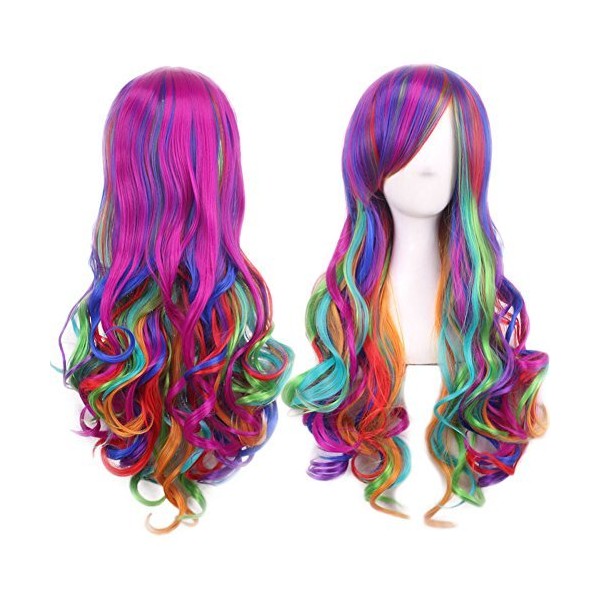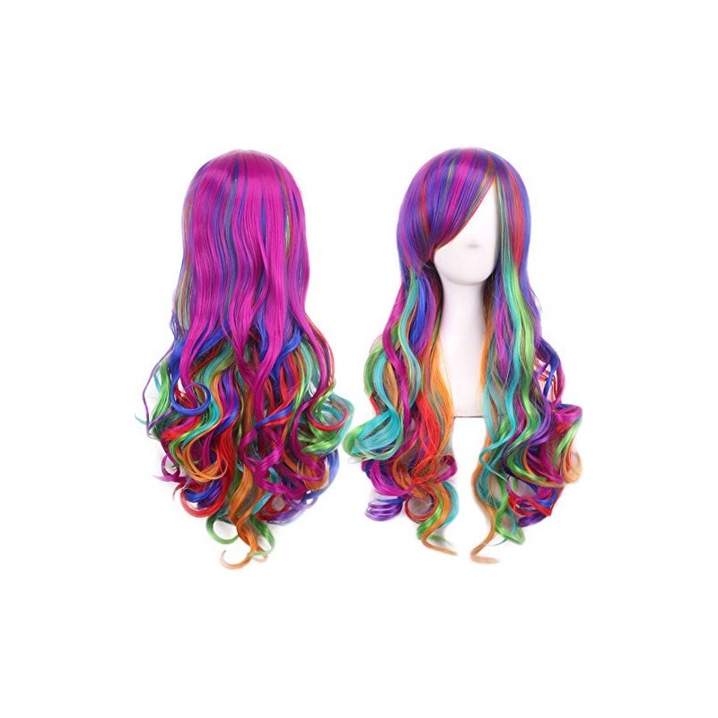 - Curly long hair wig in bright rainbow colour in layered cut can be combined in many ways