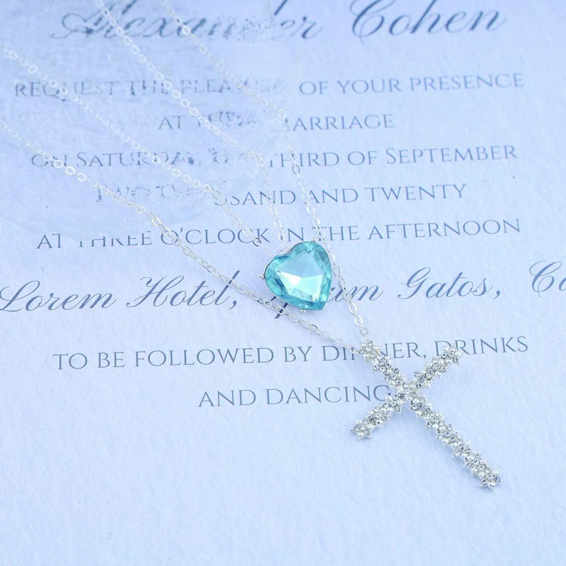 Atentuyi Boho Layered CZ Cross Pendant Necklace Silver Rhinestone Cross Necklace Crystal Cross Choker Religion Crucifix Necklace Chain Blue Crystal Heart Necklace Jewellery for Women and Girls, Zinc