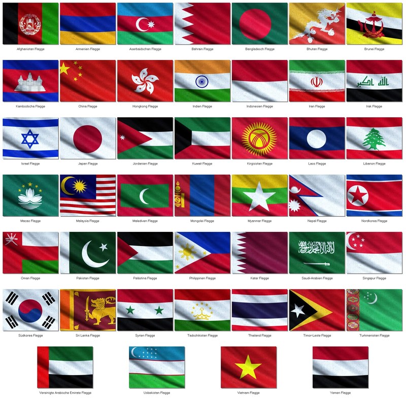 Choose your favourite design in the online configurator: Afghanistan, Armenia, Azerbaijan, Bahrain, Bangladesh, Bhutan, Brunei, Cambodia, China, Hong Kong, India, Indonesia, Iran, Iraq, Israel, Japan, Jordan, Kuwait, Kyrgyzstan, Laos, Lebanon, Macao, Malaysia, Malei. mongolelei, Myanmar, Nepal, North Korea, Oman, Pakistan, Palestine, Philippines, Qatar, Saudi Arabia, Singapore, South Korea, Sri Lanka, Syria, Tajikistan, Thailand, Timor-Leste, Turkmenistan, United Arab Emirates, Uzbekistan, Vietnam, Yemen flag.