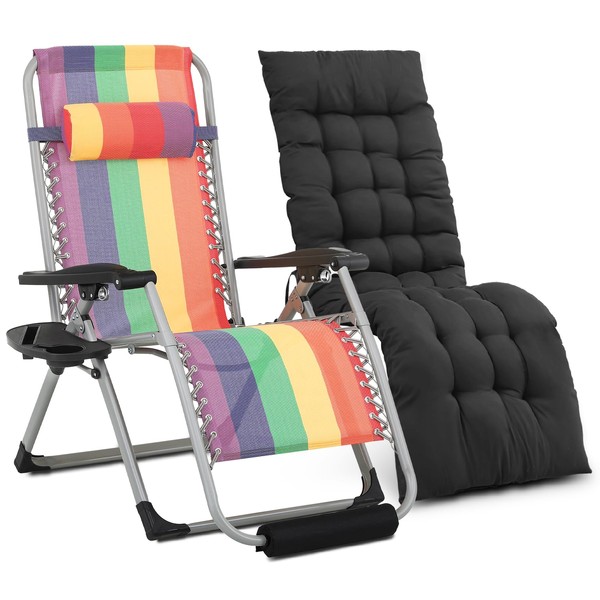Athena Collection 29'' Folding Lounge Chair for Adults, Adjustable Camping Chair Zero Gravity Chair with Removable Thick Cushion, Patio Recliner Beach Chair with Headrest Tray Footpad, Rainbow