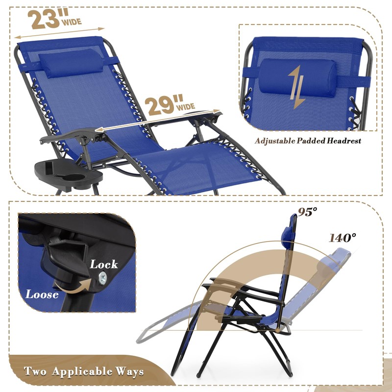 • Lounge Chairs Set of 2 with Side Table: The complete set features two zero-gravity chairs and a folding side table for comprehensive outdoor relaxation solutions.