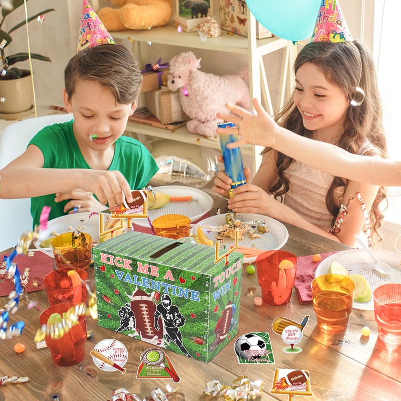 - ??? ???? ??????? - 1pcs football Valentine's Day card mailbox, 30 sports Valentine's cards, 2 football field goal post, and 50 glue dots. Enough quantity, convenient for you to choose or replace. The bright colors and lively sports prints are perfect for celebrating your kid's Valentine's Day, leaving lots of laughter