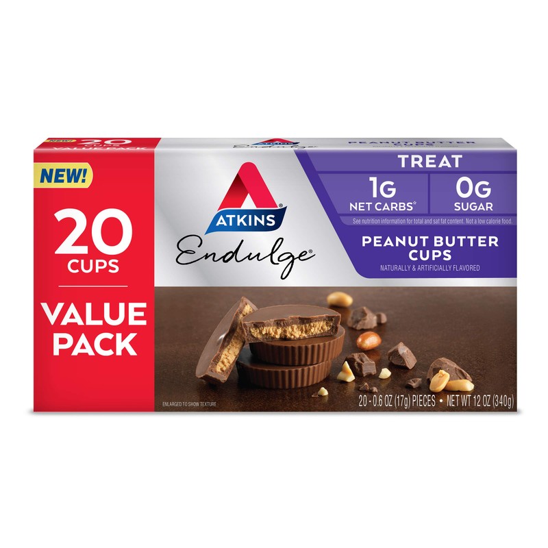 Enjoy Atkins? Endulge Peanut Butter Cups. Each one of these delicious and indulgent peanut butter cups is packed with flavors you crave. Our low sugar*, low carb* peanut butter cups are the go-to after meal treat when its time for an indulgent dessert, and the perfect way to satisfy your sweet tooth. Atkins Endulge Peanut Butter Cups have 1g of net carbs and 0g of sugar per serving*