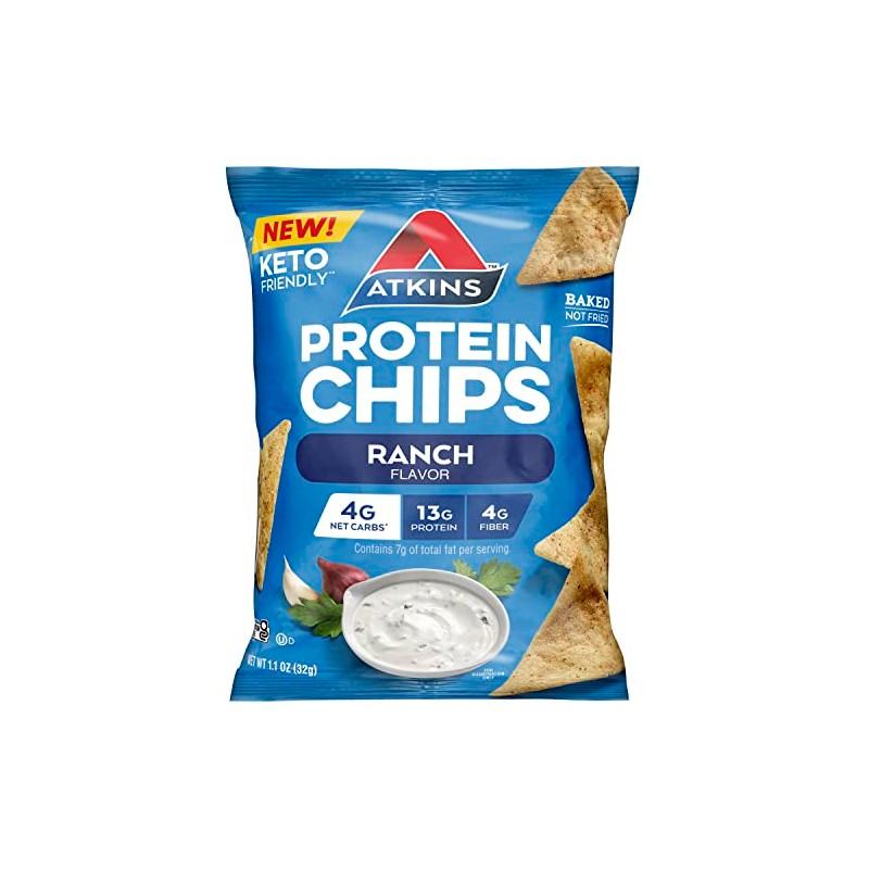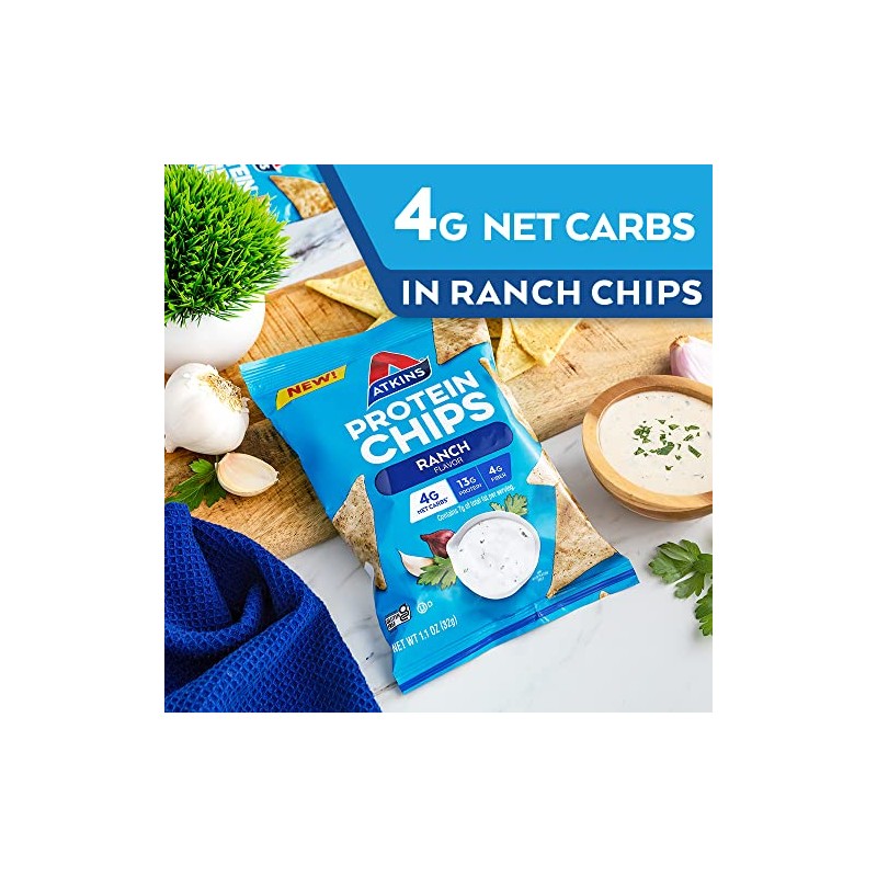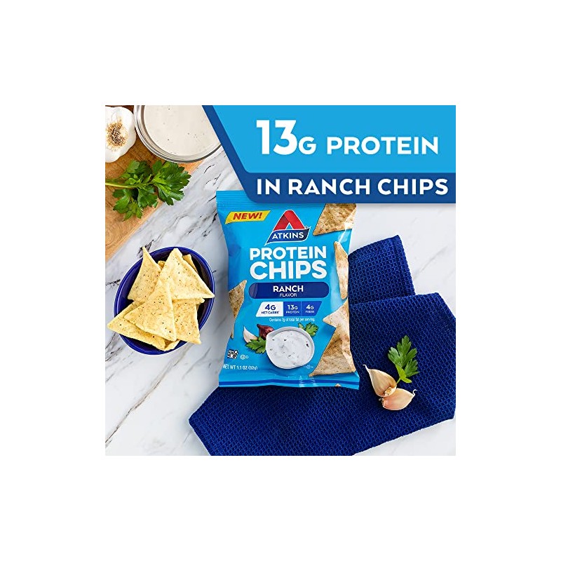 - CRUNCHY, SAVORY, GOODNESS. Atkins Ranch flavored Protein Chips are a salty and crunchy snack that won't sideline your nutritional goals, with 13g of protein and 4g of net carbs per serving*. This is Today's Atkins.