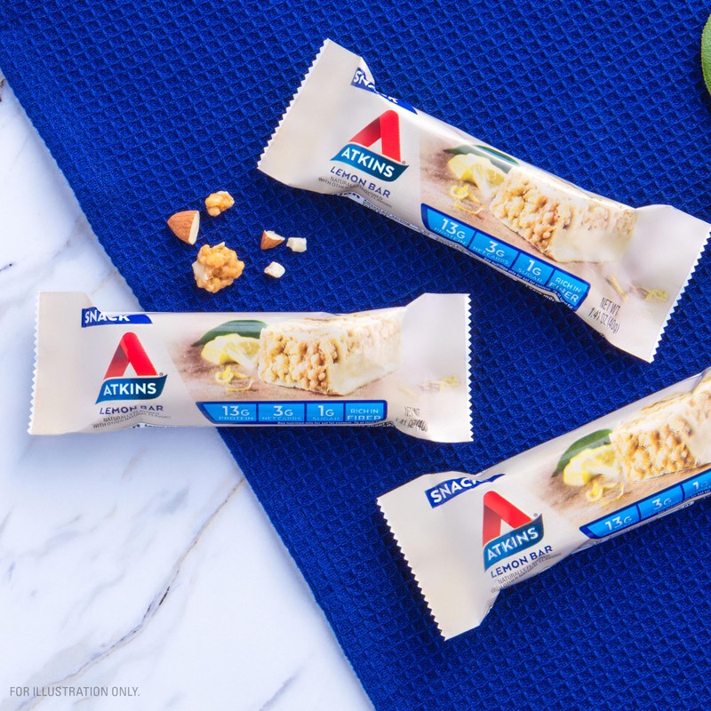 - AT HOME OR ON-THE-GO. Atkins flavored Snack Bars have the bright, tart taste of lemon in a satisfying bar. Enjoy delicious snack bars that fit right into your busy schedule, with 13g of protein, 3g of net carbs and 1g of sugar per serving*.