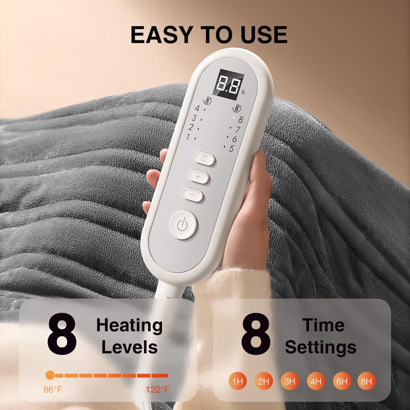 - Customizable Heat & Timer Setting: With 8 adjustable heat levels, you can precisely set the temperature to meet your personal warmth needs, creating a cozy and comfortable environment tailored just for you. The 1–10 hour timer setting automatically shuts off when time is up, keeping you safe and comfortable from short naps to all-night use.