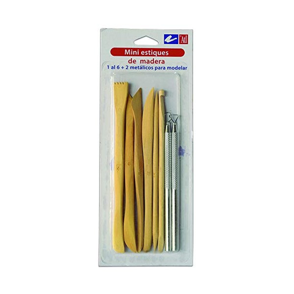 Estiques con mango de madera y puntas de alambre por ambos lados con diferentes formas. Ideal para modelado de arcilla, pasta para modelar y plastilina de escultor. Puntas con bordes biselados para corte. Puntas con bordes redondos para modelar. Presentación: juego con 6 Piezas de madera y 2 piezas de metal