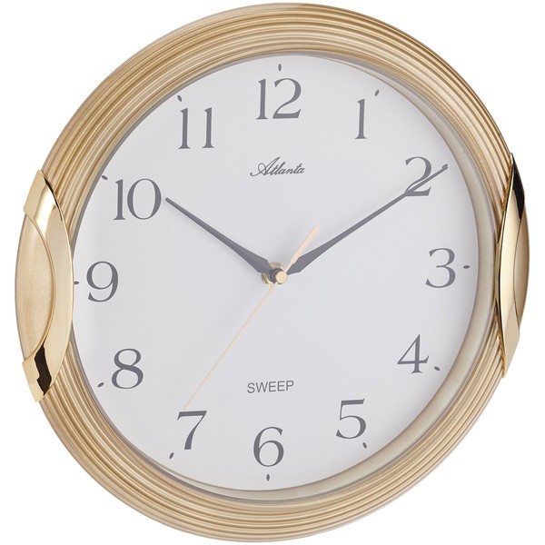 - BESONDERHEIT: Schleichende Sekunde (besonders Geräuscharm) | FARBE: Goldfarben | MAßE: Durchmesser 30 cm | MATERIAL: Hochwertiges ABS-Gehäuse, goldfarben | UHRWERK: Geräuschloses Quarzwerk | ZEITANZEIGE: Zifferblatt, analog, weiß, Zeiger schwarz, Ziffern