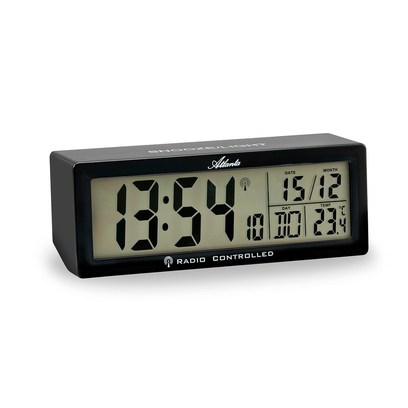 - Large LCD display with 3 cm height Additional displays of temperature, date, day of the week.