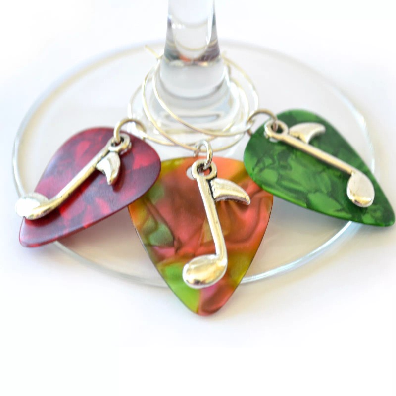 - Assorted guitar picks with unique charms adorn these wine glass markers