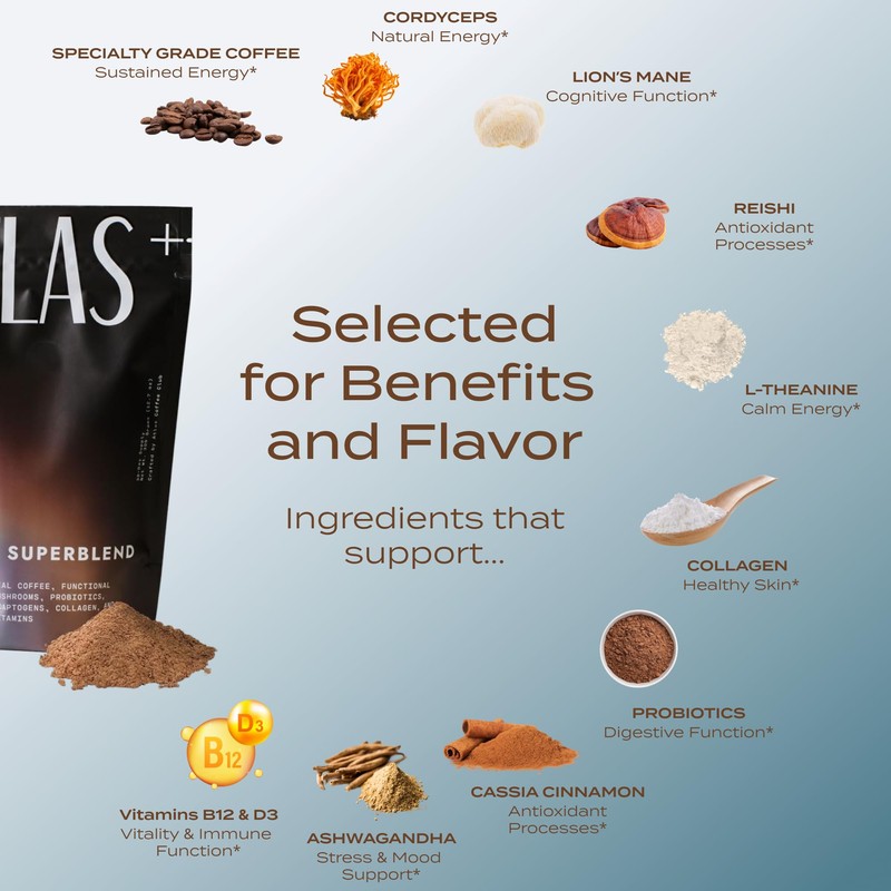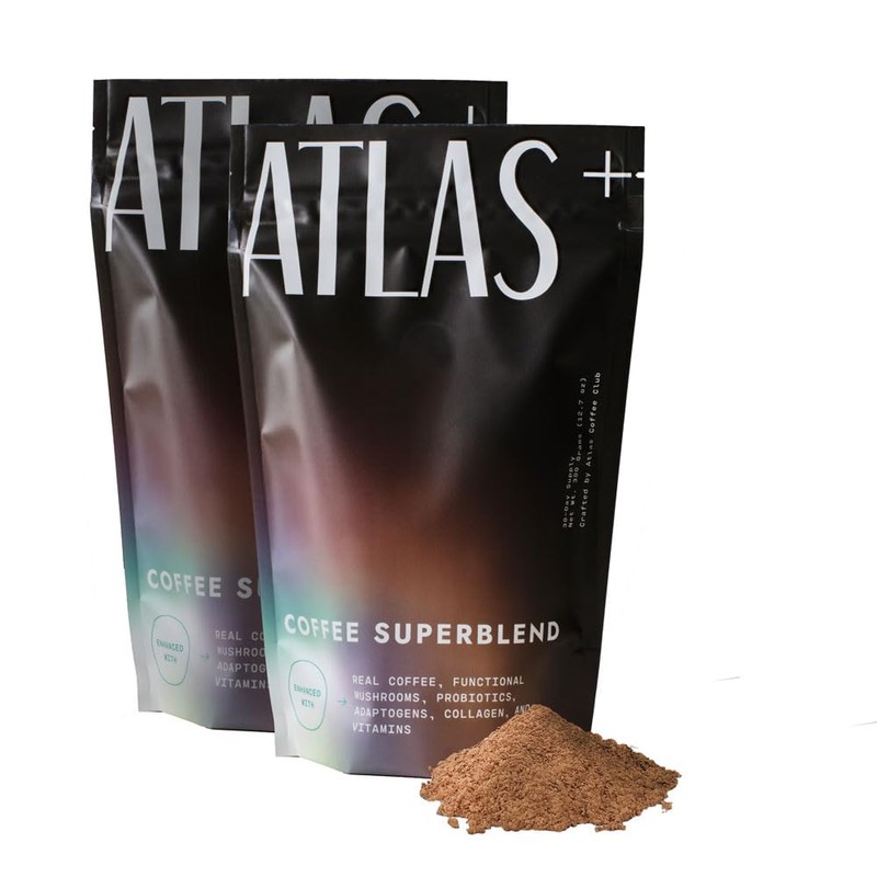 ATLAS+ Coffee Superblend Mushroom Coffee. All-in-one benefits (focus, energy, digestion, immunity) with Probiotics, Ashwaganda, Lion’s Mane, Reishi, Cordyceps, Vitamin B12 + D3 (54 servings/2 bags)
