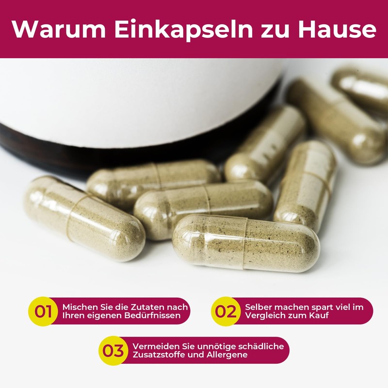 - Easy to take and universal fillability: the capsules have a smooth and well thought-out shape that makes swallowing easier, even for people who usually have difficulty with tablets. They are ideal for filling with powder, vitamins, herbs or other dietary supplements and allow precise dosage of your personal mixtures.