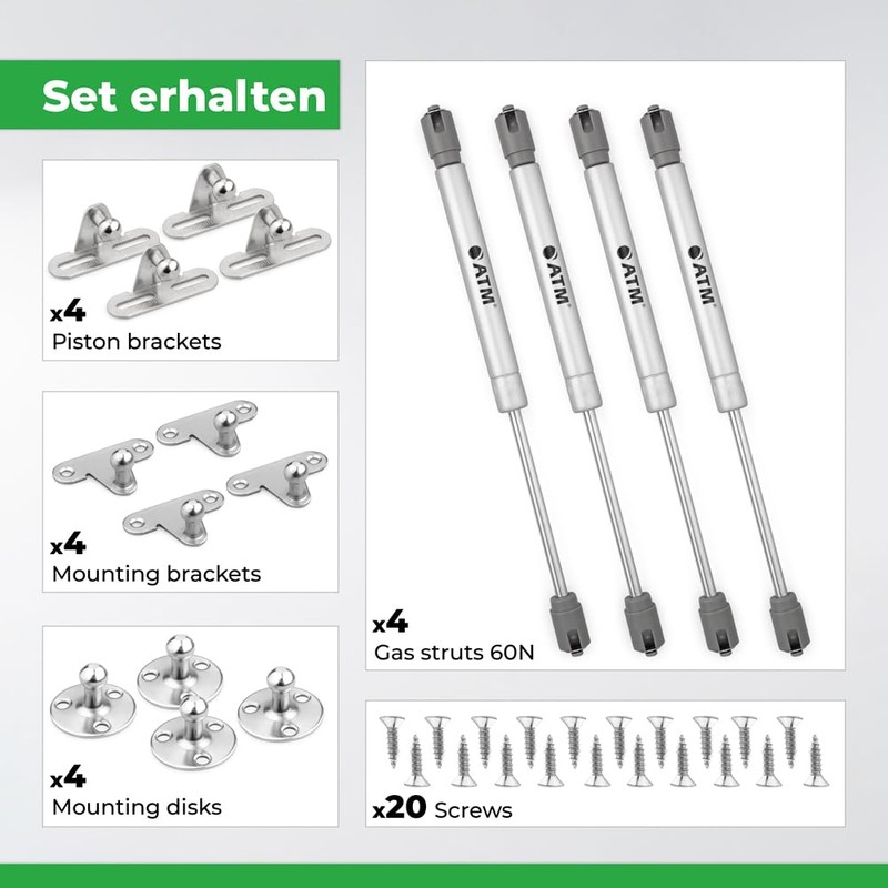 ATM® Gas Pressure Damper for Furniture and Flap Fronts | Opening Angle 80°-100° | Easy Assembly | Soft Opening | Speed Control | Robust Construction | Pack of 4 | Force: 60N