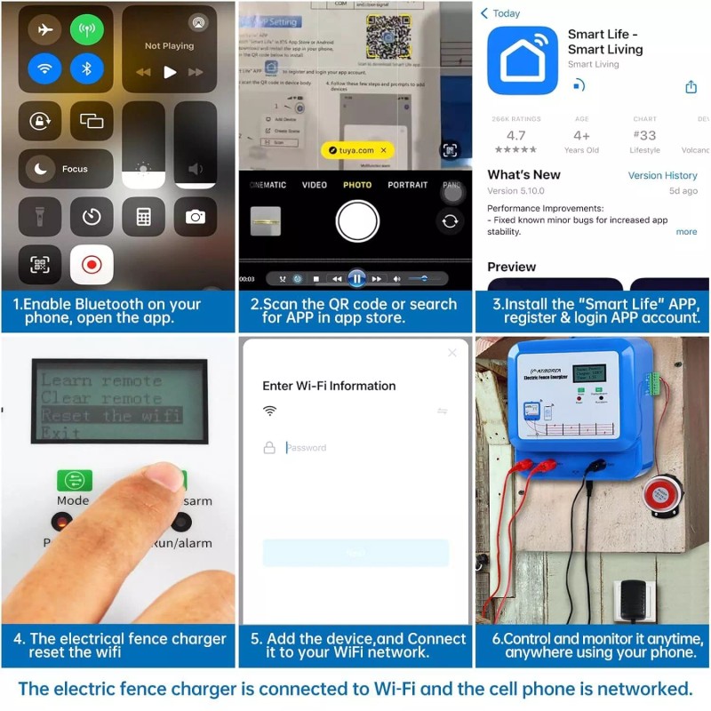 Control the electric fence host remotely and set up smart scenes through WiFi, remote control. Enables remote alarms and real-time status monitoring on cell phones