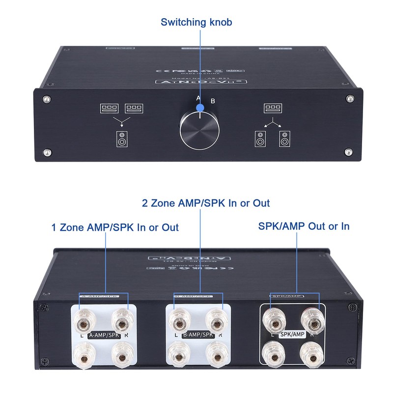 AtNeDcVh 2 Zone Amplifier Speaker Lossless Switcher Selector, 1 In 2 Out / 2 In 1 Out Amps Speakers Switch Control Box Splitter, 2 Way Stereo Audio A B Switches