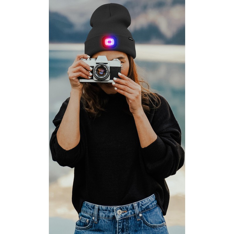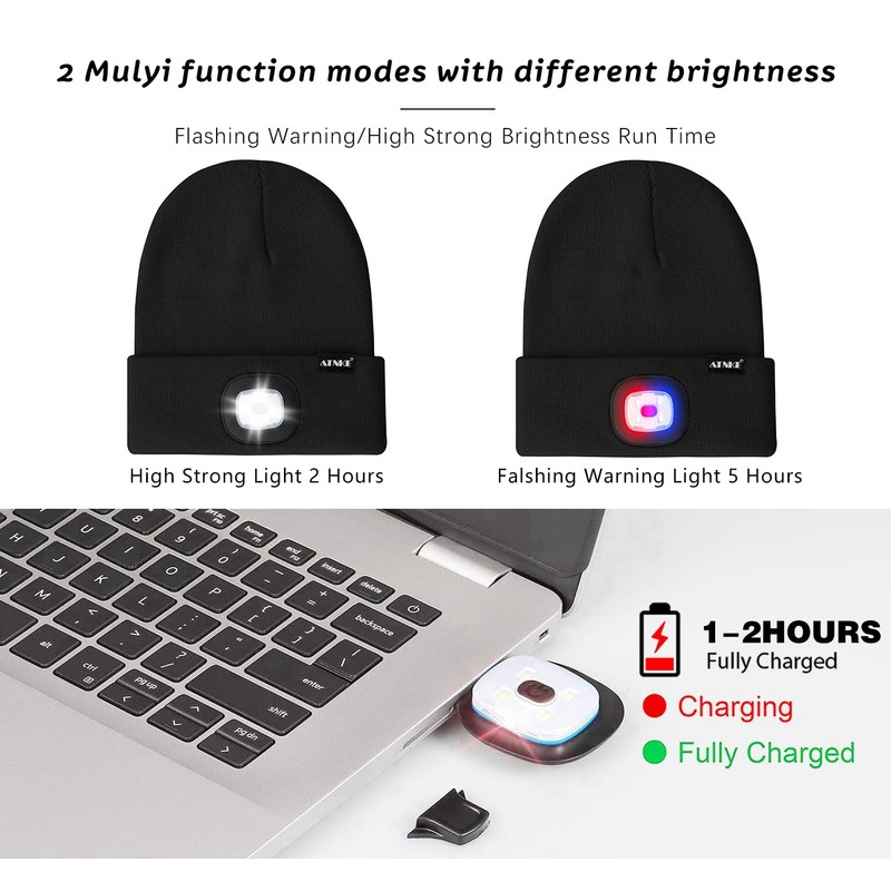 - MULTIFUNCTION VISIBILITY & SAFETY:You can adjust the brightness by pressing the button. There are 2 modes for you to choose the most suitable brightness.The first level of white light mode, the highest level can last for 2 hours, the second level of red and blue light mode has its flashing function, the highest level can last for 5 hours,no longer re-purchase and change batteries for your light up beanie, only a standard USB port from the computer or mobile phone charger.