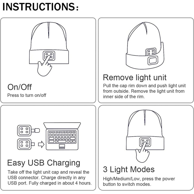 - VISIBILITY & SAFETY:You can adjust the brightness by pressing the button. There are 3 modes for you to choose the most suitable brightness. It can last up to 6-8 hours in the lowest level, 4 hours in medium level and 2 hours in the highest level.No longer re-purchase and change batteries for your light up beanie, only a standard USB port from the computer or mobile phone charger. press the button in the middle of LED light to switch on/off.
