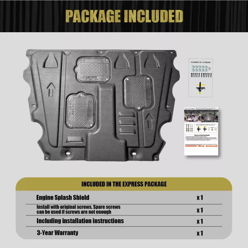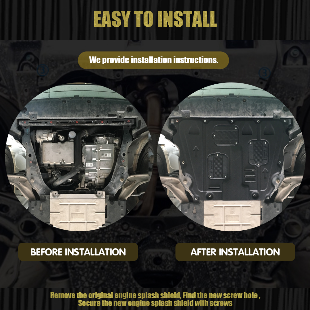 Remove the original engine splash shield, Find the new screw hole ,Secure the new engine splash shield with screws. Suggest professional installation, under normal circumstances, do not need to drill holes.the car model changes, may need to drill holes.
