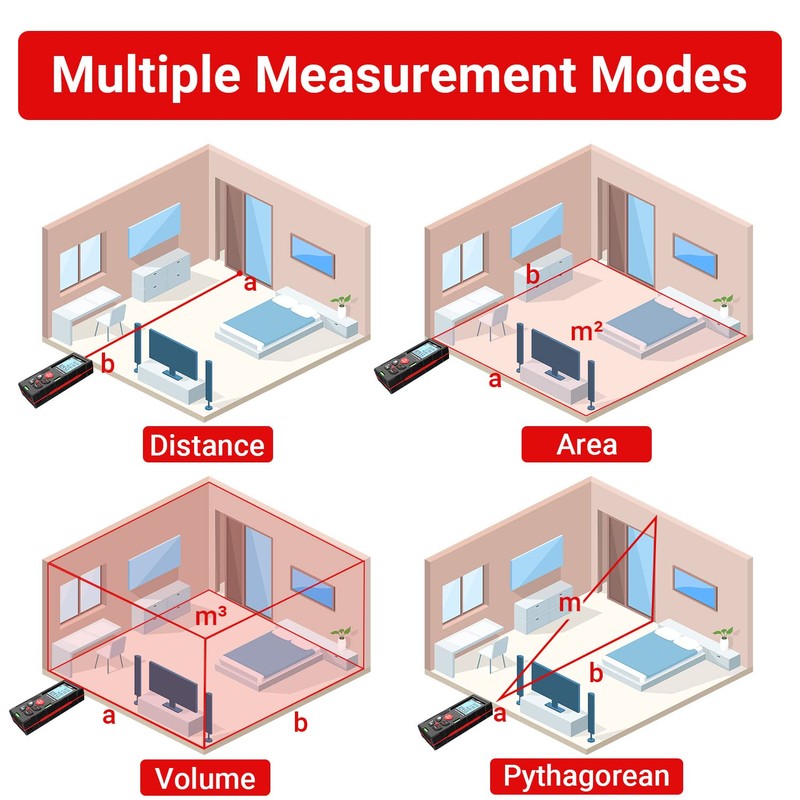 With multiple measurement modes like area, distance, length, volume and Pythagorean methods, the laser level can be widely used in household & engineering decoration, construction, city planning and industries.