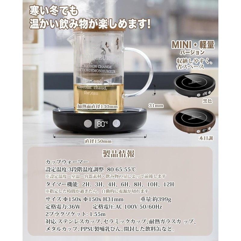 - (2 types of PSE safety certification / Exquisite appearance design / Perfect as a gift) Our cup warmer comes with 2 types of PSE marks. Safe use is guaranteed to prevent hazards to consumers due to failure. Japanese Design · Distinctive Wood Tone/Black Tone--A great gift for family and friends. Use it in your office or home for birthdays, Valentine's Day, Christmas, Respect for the Aged Day, Mother's Day, Father's Day, Seniors and other special occasions, and your hot drink will stay hot over time, so you can drink delicious until the last sip. Product information 1: Size (W x D x H): 5.9 x 5.9 x 1.2 inches (150 x 150 x 31 mm); Approx. 13.6 oz (399 g); 2 plug socket: 3 levels of constant temperature adjustment: 80 - 65 - 55 °C); 5 timer settings: 2H, 3H, 4H, 6H, 8H, 10H, 12H 12H