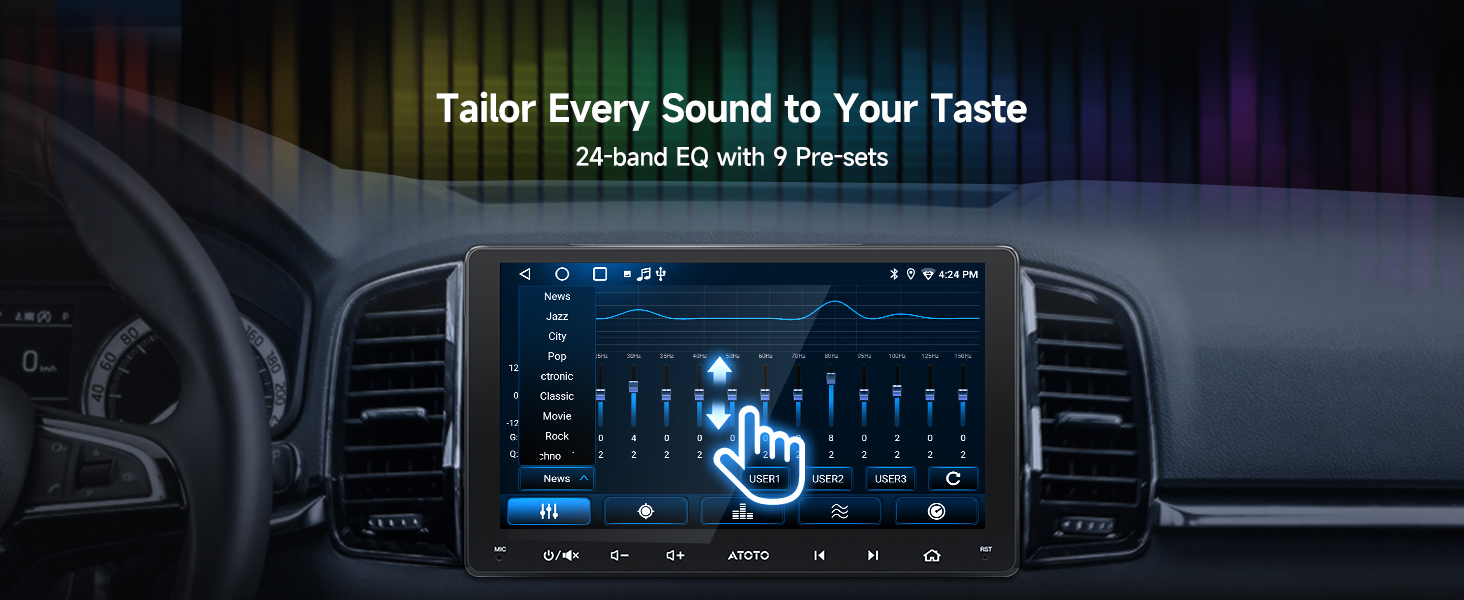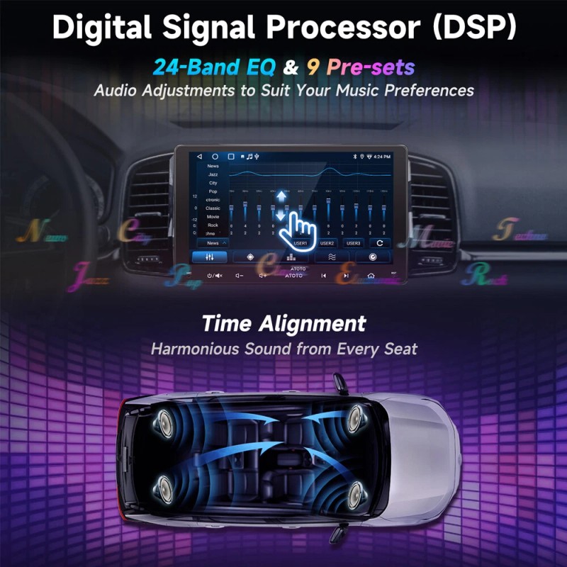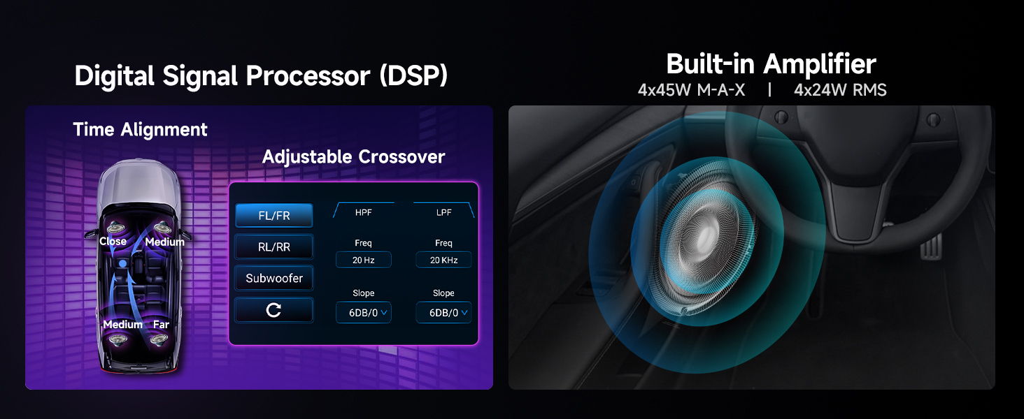 - Upgraded 24-Band EQ DSP: A5Lite android auto head unit features a built-in amplifier (M-a-x 4x45W, RMS 4x24W) and a 24-Band EQ with 9 presets. Adjust sound according to your preferences with Digital Signal Processor (DSP), providing a tailored listening experience